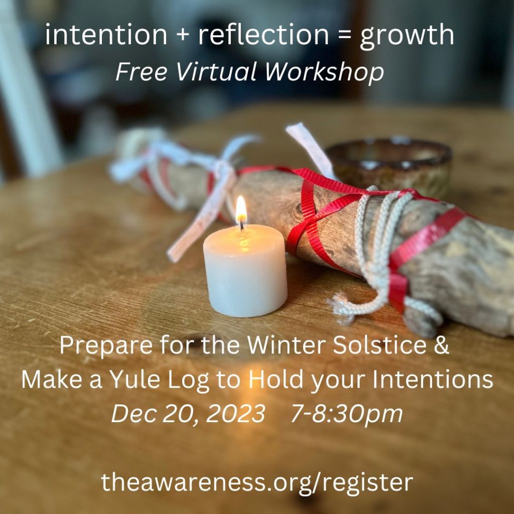 In preparation for the winter solstice (Dec 21) we’ll meditate and construct a yule log, upon which we’ll attach behaviors from the past year that no longer serve us as well as our intentions, affirmations and resolutions for the new year. You may wish to leave your yule log out on a table or shelf during the holiday season so you can add additional intentions and affirmations.